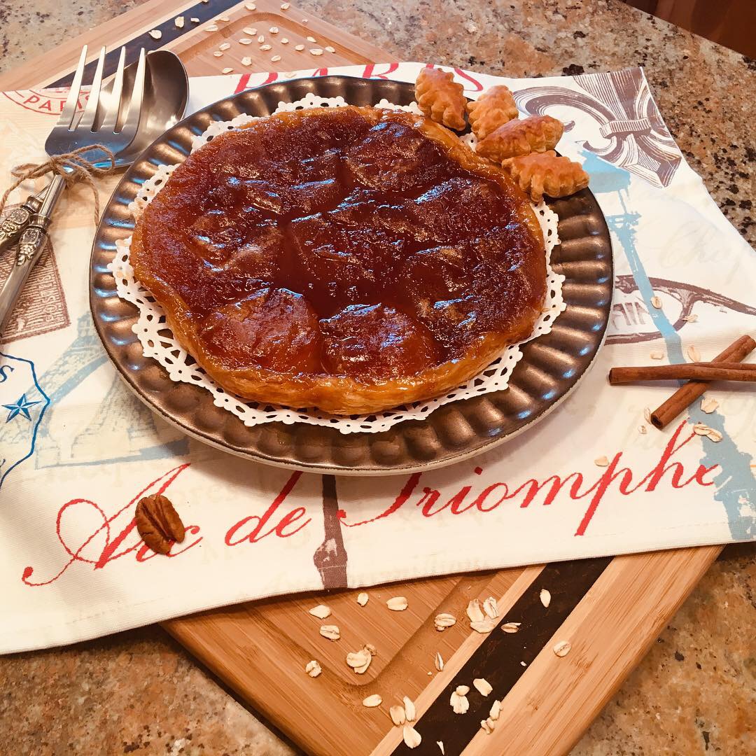 - Place a round serving plate upside-down over the skillet and invert the tart onto the plate, do it quickly & carefully. Cut the tarte tatin into wedges and serve immediately.