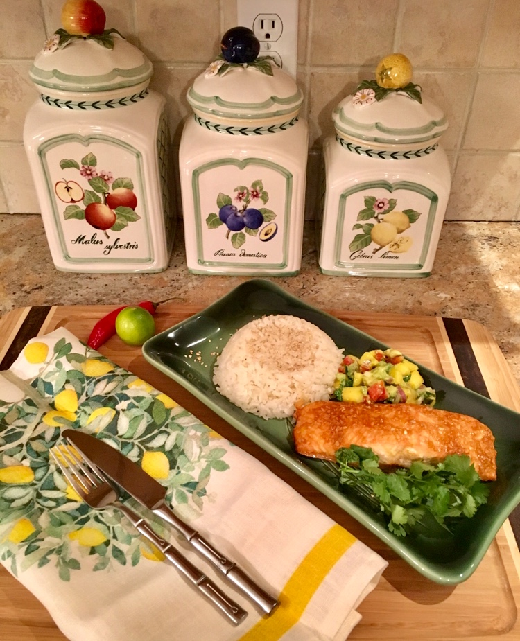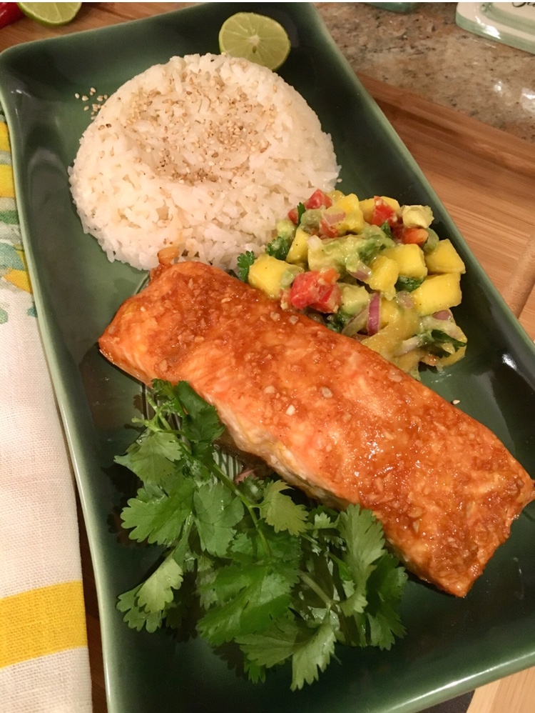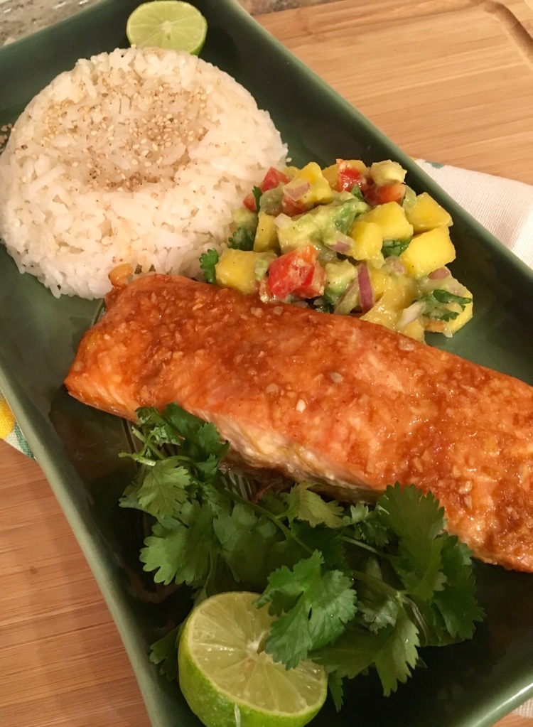 In a medium bowl, combine all the marinade ingredients very well and marinate the Salmon for at least two hours.