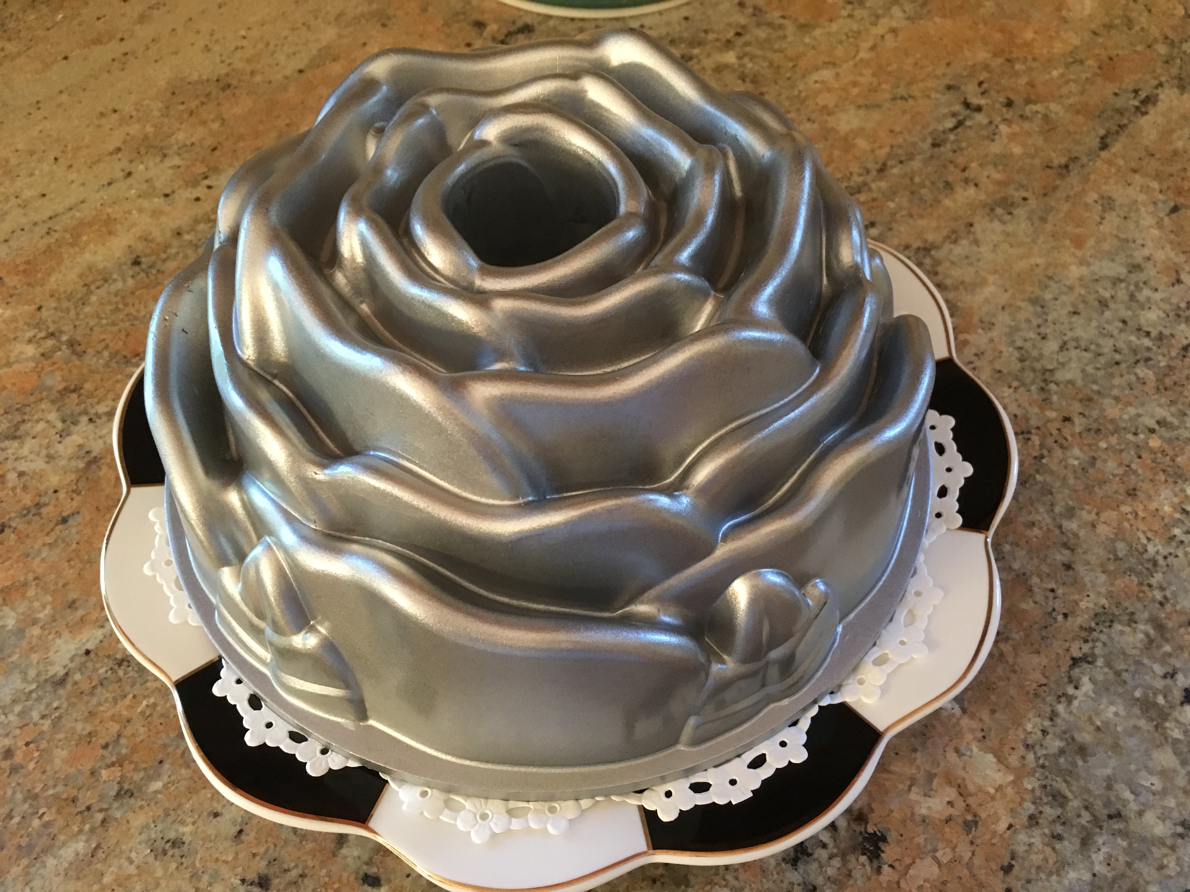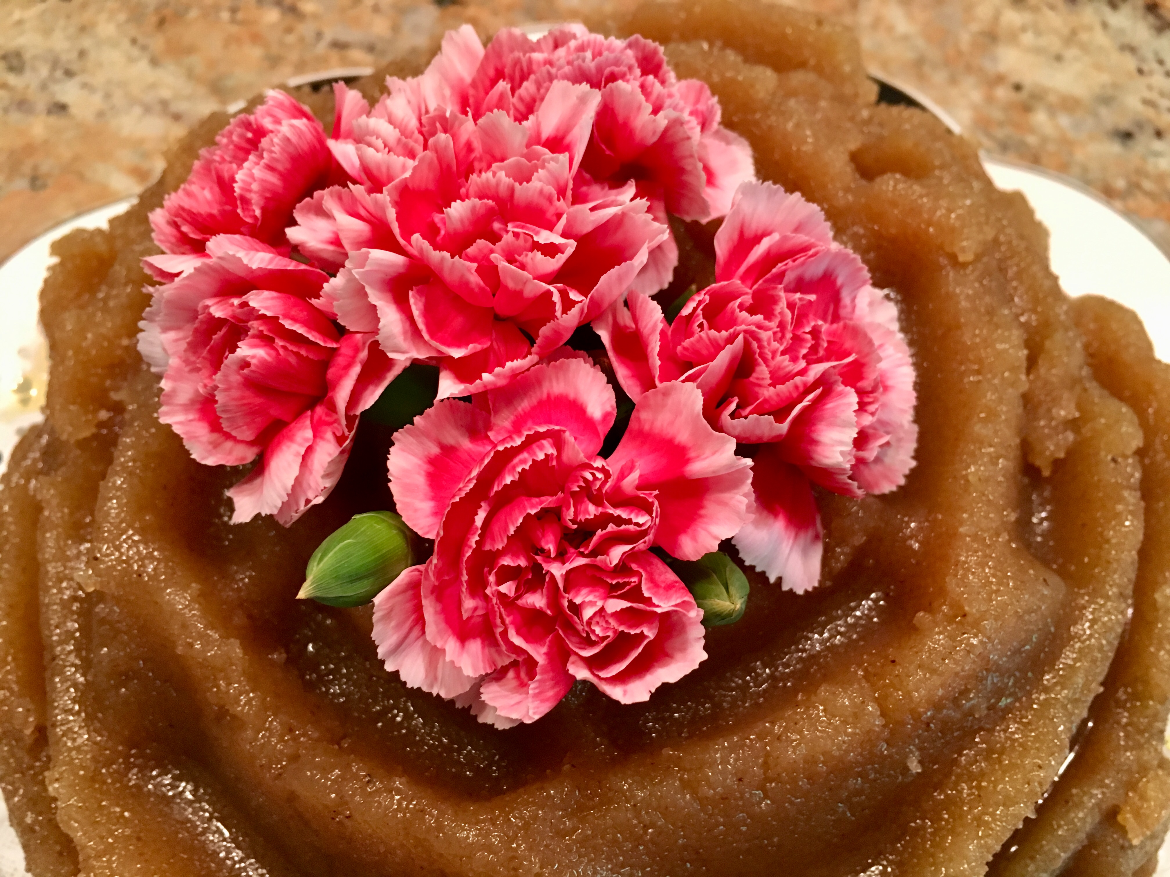 Turn the heat off, let it sit in the pot, covered with a clean kitchen towel for half an hour, then scoop it into a mold and cover it with a towel for another hour until it sets into the shape of the mold. Transfer it to a serving plate and garnish it as you like. You can dust it with cinnamon and sprinkle it with chopped nuts. I used a rose shaped cake mold for my Semolina Halva and fresh carnations to garnish.