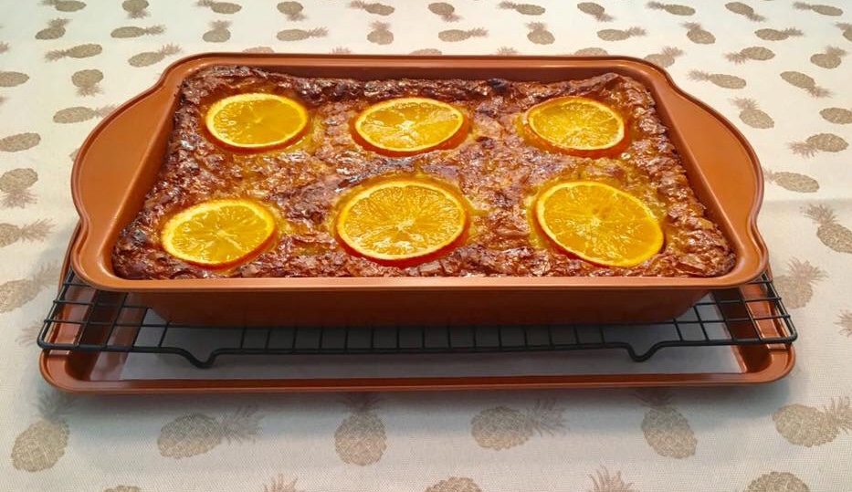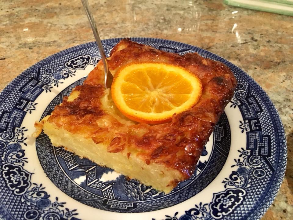 Make the syrup by bringing the sugar, water, orange juice, orange zest and cinnamon stick to a boil and let it simmer over medium heat for 4 minutes. Remove from heat, take out the cinnamon stick and let the syrup cool completely before pouring it over the hot cake.