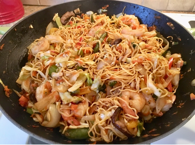 Add the sauce to the veggies in the wok and bring to a simmer. Toss in the shrimp and noodles and serve.