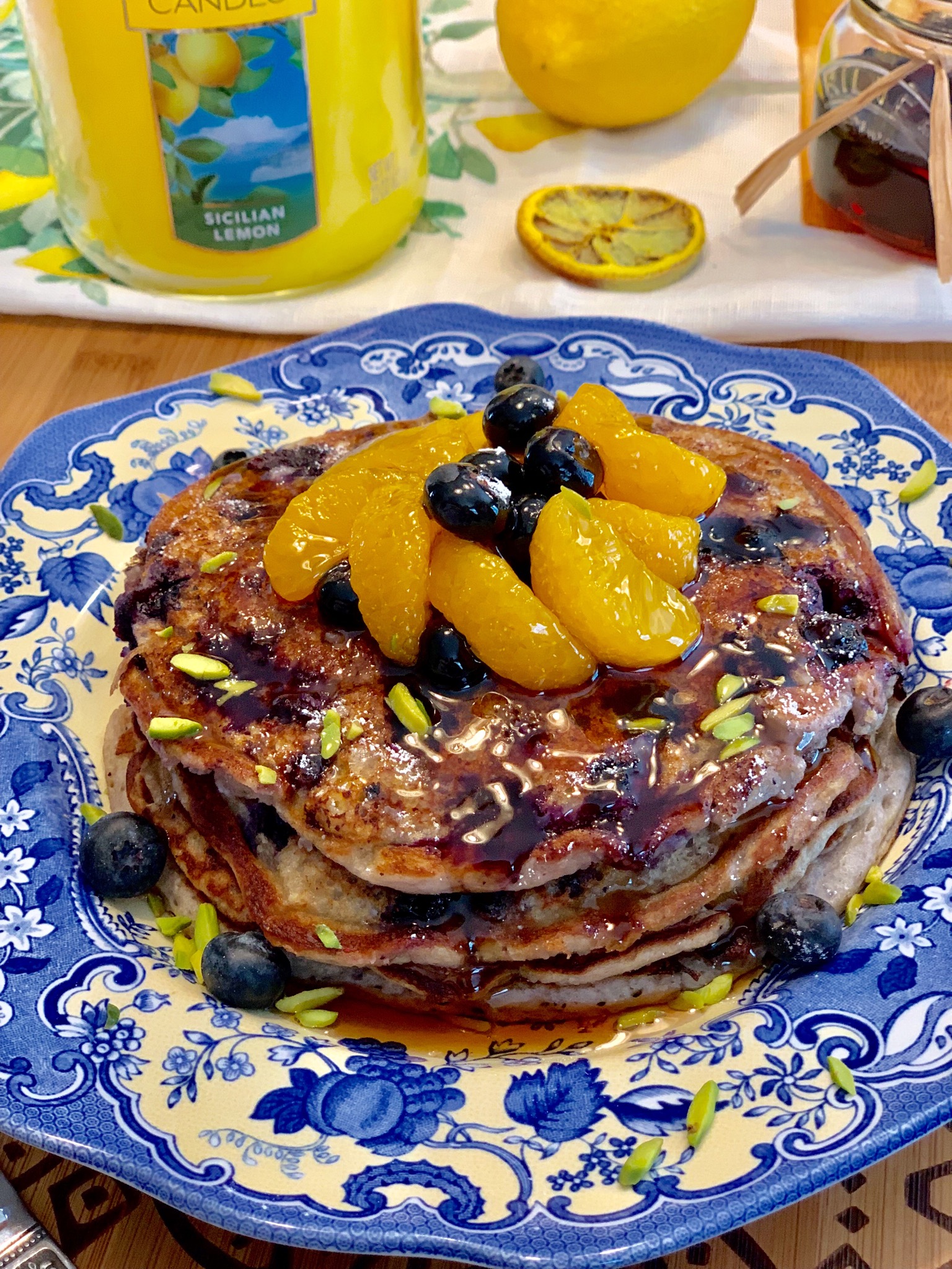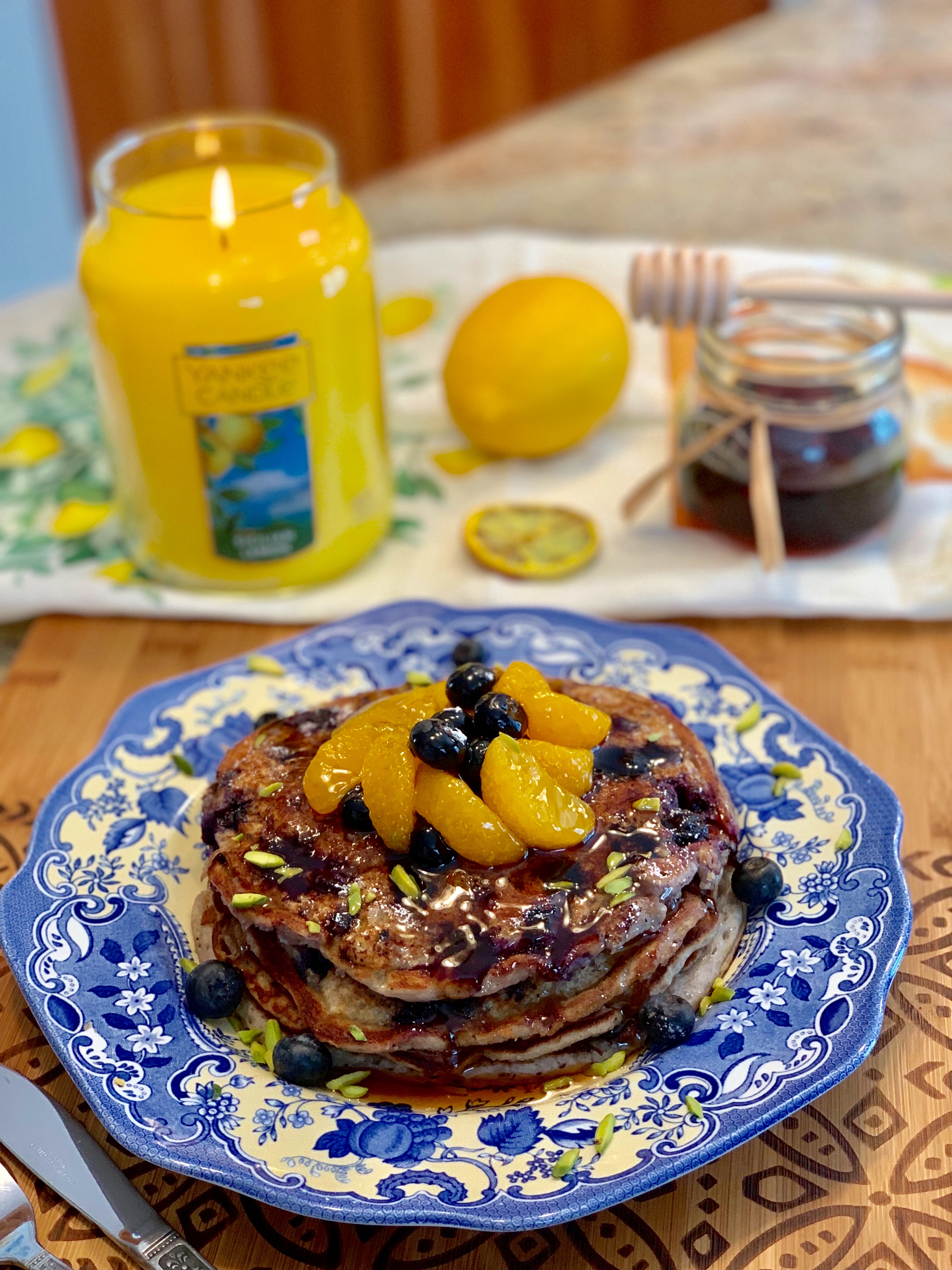 In a mixing bowl, whisk together eggs, vanilla, butter, honey, lemon juice, lemon zest and ricotta cheese. Swift in the flour, salt and baking powder and combine all very well. Fold in the blueberries and blueberry jam and let the batter sit for 10 minutes.