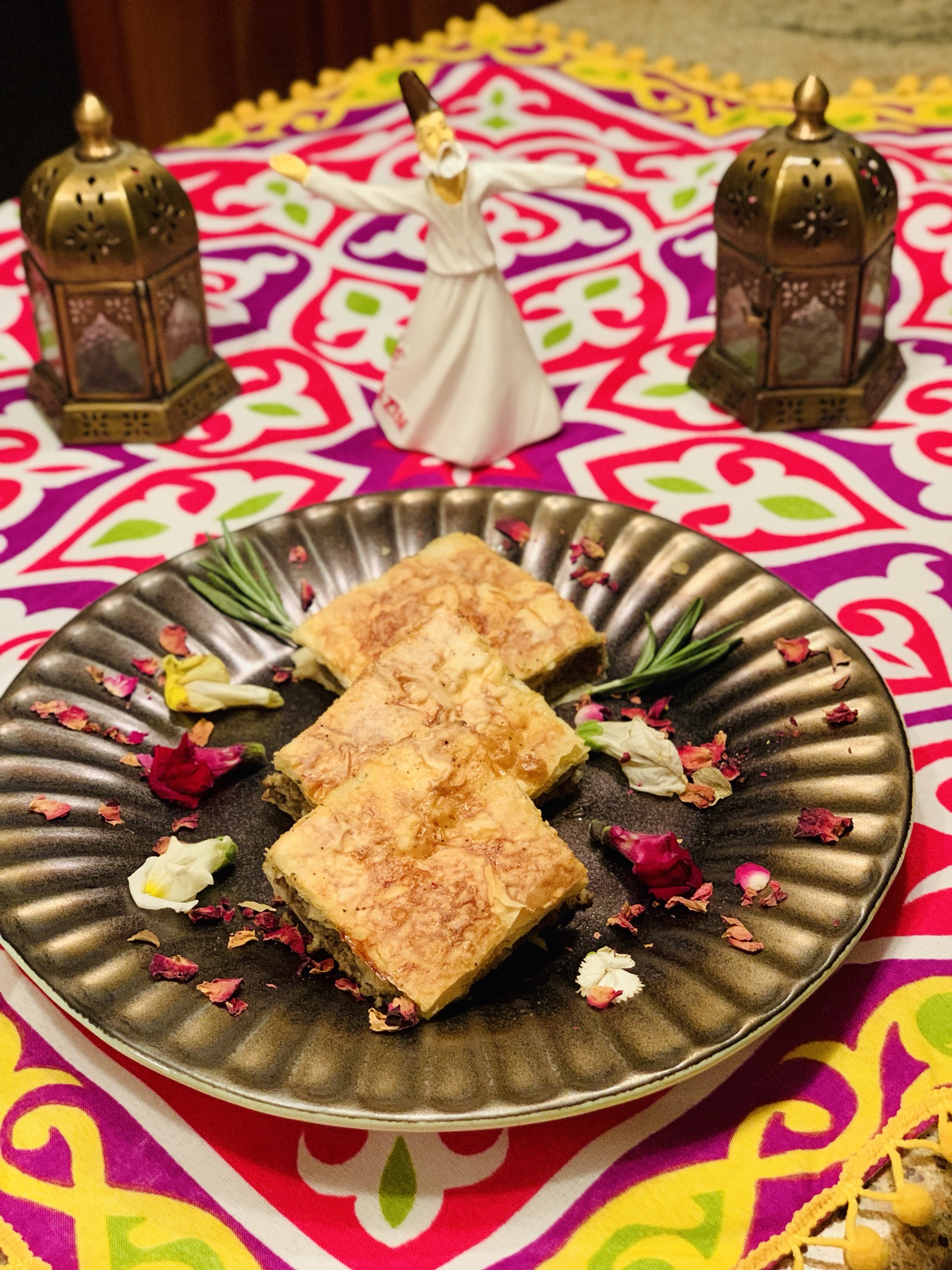 Carefully lay the thawed phyllo dough sheets between two lightly damp kitchen towels. This will keep the Phyllo from drying while you’re putting the pie together.