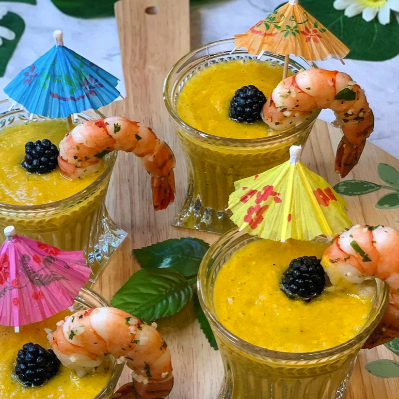 Blend on high speed until all the veggies are puréed and if it’s too thick to be pourable, add 1-4 tbsp vegetable stock to bring it to the desired consistency. I used some very juicy heirloom tomatoes, so I didn’t need to add any stock. I served it with grilled shrimp and breadsticks 🍤🌿🥖