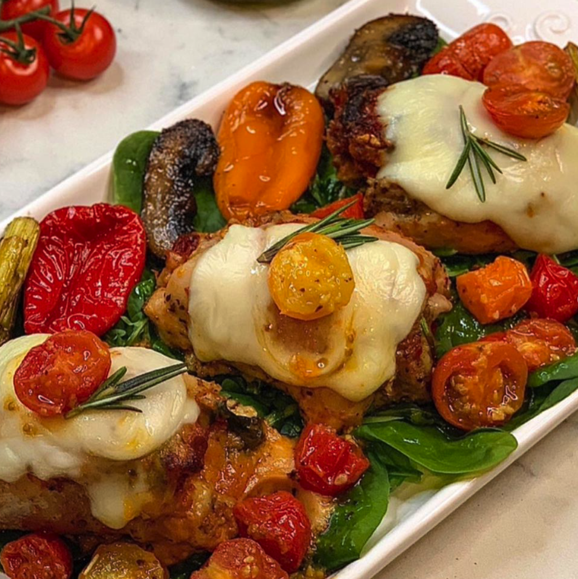 Boneless chicken thighs seasoned to perfection and smothered with basil pesto. Stuffed with baby spinach, shredded mozzarella cheese, and sun-dried tomatoes. Served with roasted asparagus, brussel sprouts, portabella mushrooms, and baby peppers.