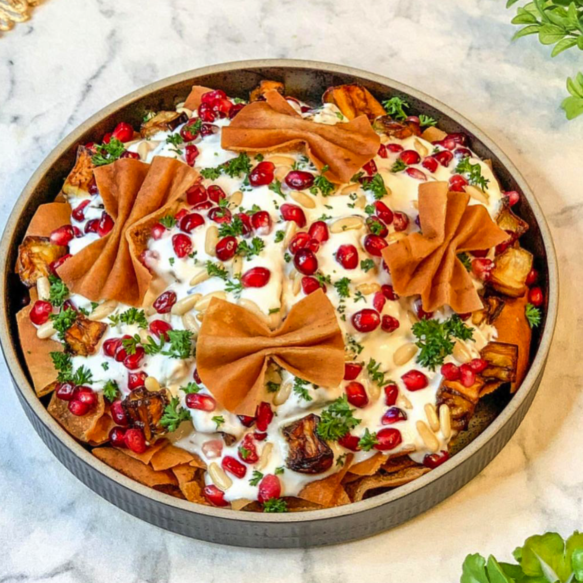 A layer of pita chips, topped with eggplant cubes, and drizzled with a delicious tahini yogurt sauce; garnished with fresh parsley, pomegranate, and pine nuts… Ooooh Lalaaah‼️
