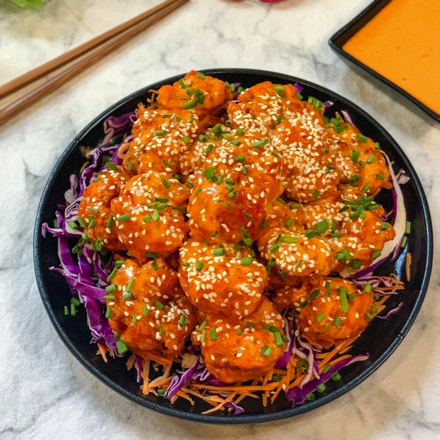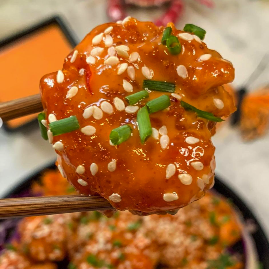 🍤 Toss fried shrimp in the Bang Bang sauce and top with some sesame seeds and chopped chives.