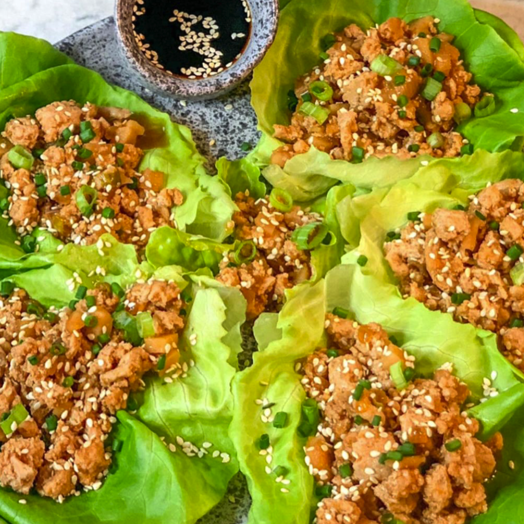 🥬 Serve with butter lettuce, scooping chicken mixture into lettuce leaf “bowls.” Sprinkle some sesame seeds, chopped chives, and scallions on top.