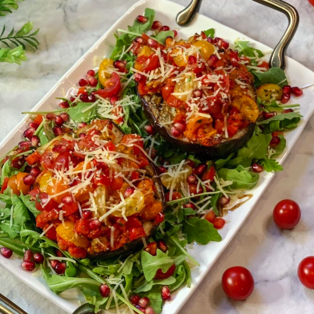 Roasted eggplant, topped with baked bruschetta and fresh pomegranate, served warm on a bed of arugula, grated cheese, with a drizzle of pomegranate molasses on top. Can’t beat this flavor combination 🥗🍅🍆🫑👌🏻