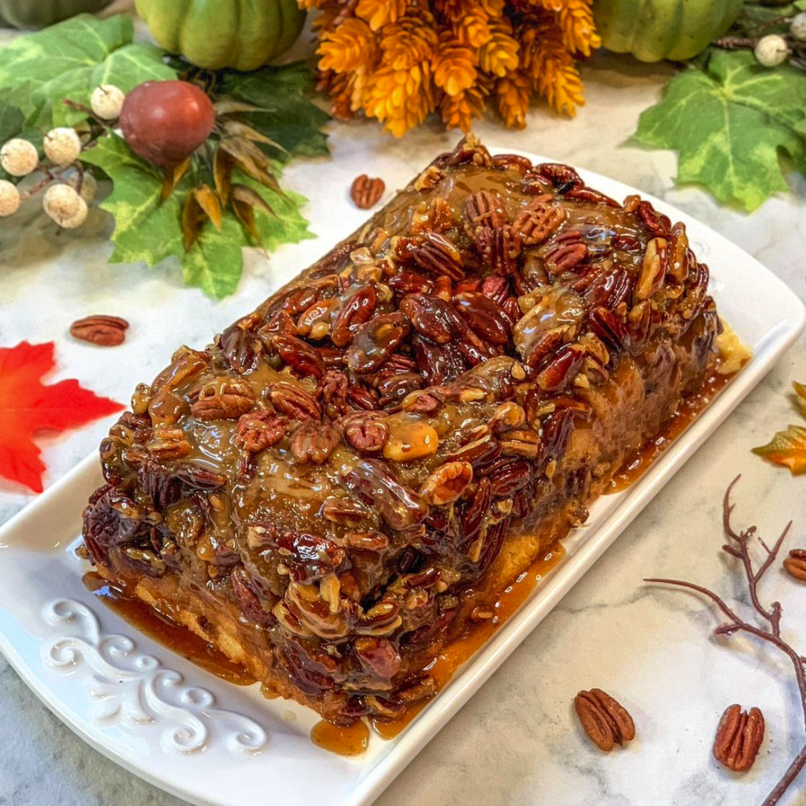 🥮 Pour cake batter over the pecan topping and bake in a preheated 340F oven for about 50-60 minutes, or until a cake tester inserted in the center comes out clean. Allow the cake to cool for 10 minutes before flipping it on your serving platter.
