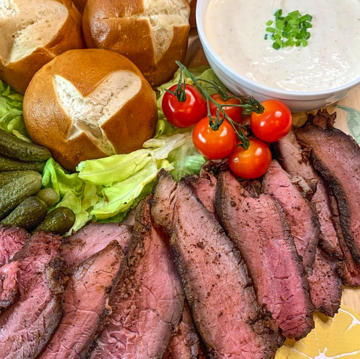 I put together a nice steak board; paired my sliced London Broil with pretzel buns, sautéed onions and mushrooms, and my delicious homemade horseradish sauce; and I also made some open-face cheesesteak sandwiches, and they were a big hit!