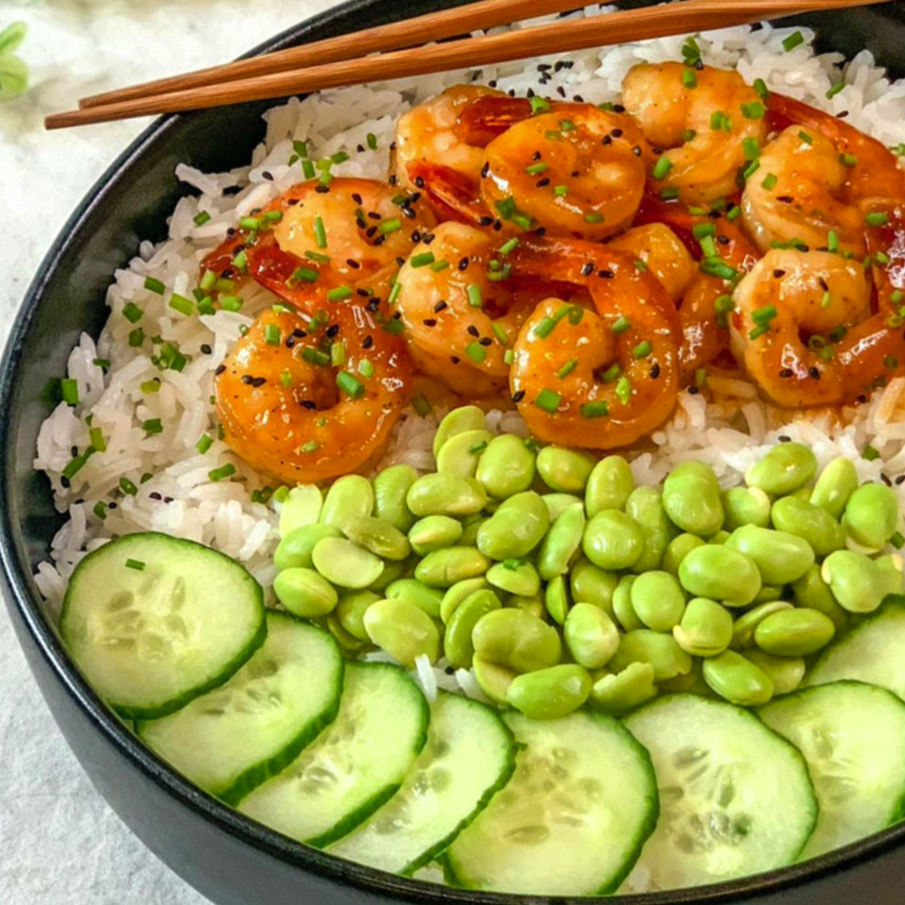 🍲 Assemble your bowl to your taste and liking. I placed the shrimp, edamame, sliced cucumber on top of steamed jasmine rice and garnished it with sesame and chopped chives. Spoon any extra sauce over shrimp for extra flavor.